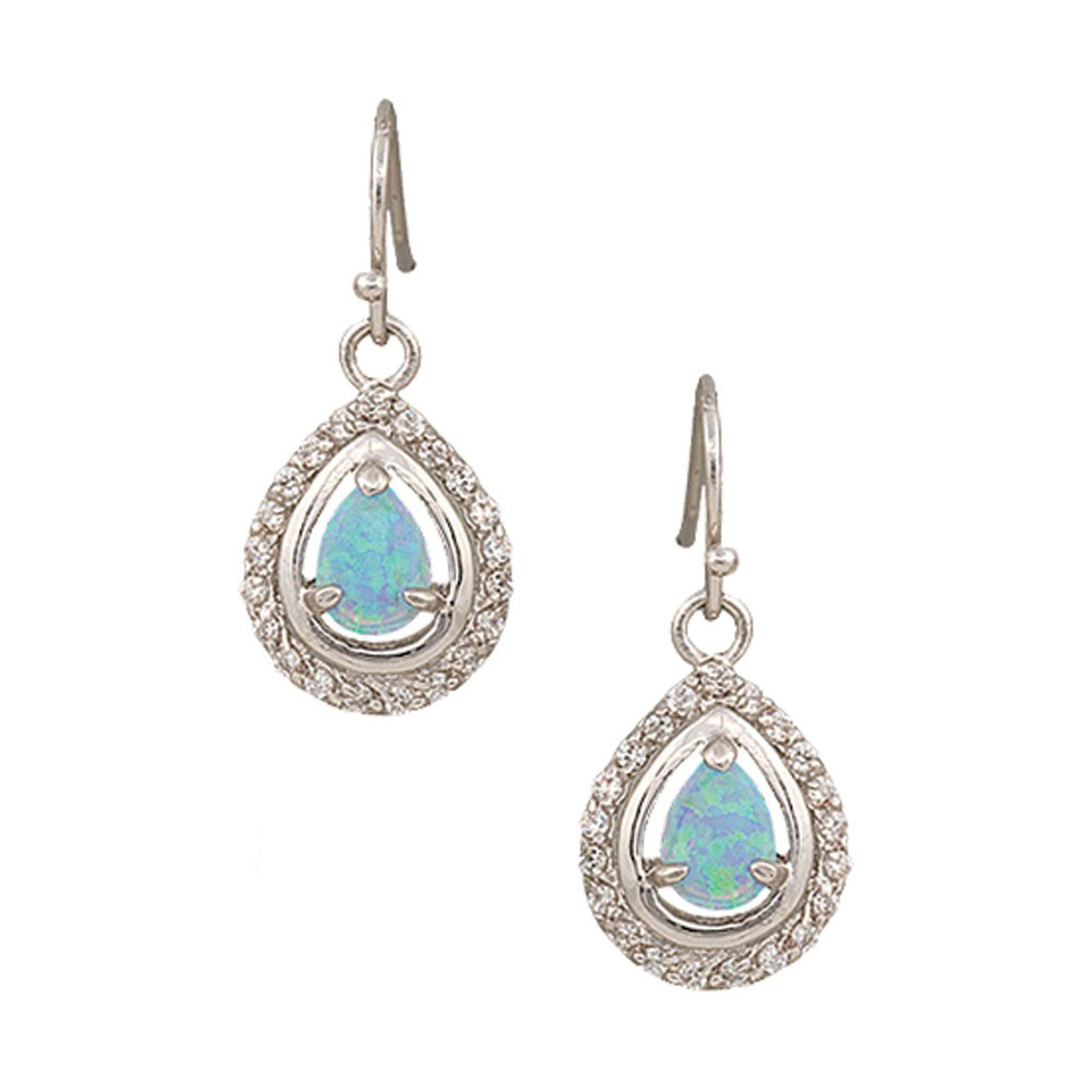 Petite earrings with center teardrop shaped opal surrounded by a line of clear stones hanging on French hooks.